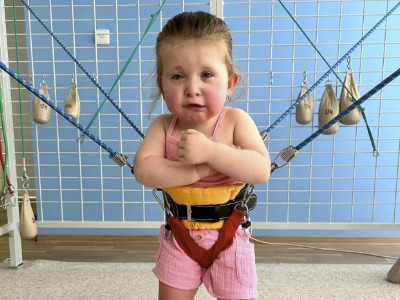 V září mi budou 3 ročky. Zvládnu se sama přetáčet, plazit, sedět, chodit po čtyřech, stavět se na špičky k nábytku, ale neobchazím, nechodím. Mám doma kraniální ortézy a vertikalizační stojan, který mi má k mým prvním krůčkům pomoci.